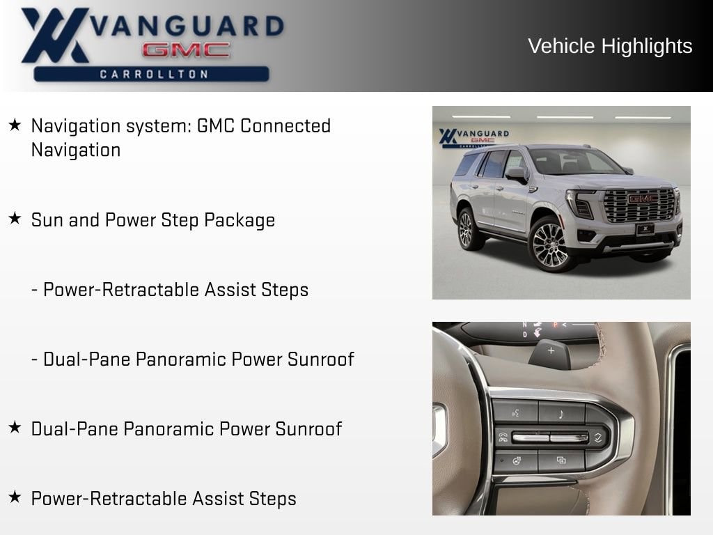 Whether you're transporting your family in comfort or embarking on a weekend getaway, the 2026 GMC Yukon Denali Sun and Power Step Package is the perfect companion. Experience the pinnacle of luxury and capability today. Contact us to schedule a test drive and discover the exceptional qualities of this remarkable SUV.