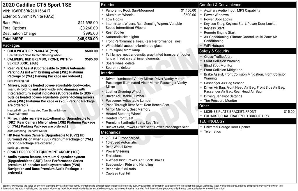 Elevate your driving experience with this exceptional 2020 Cadillac CT5 Sport. Boasting a powerful 2.0L turbocharged engine, this sleek and sophisticated sedan delivers an exhilarating performance that will captivate your senses.- Sunroof, UltraView, Dual Pane, Spans Both Rows of Seating- Red Brembo Calipers, Front and Rear- Cold Weather Package with Heated Seats and Steering WheelThe CT5 Sport's striking exterior is accentuated by its 19-inch premium painted alloy wheels with a satin graphite finish, creating a bold and dynamic presence on the road. Step inside and you'll be greeted by a refined and well-appointed cabin, featuring leatherette seating surfaces and a host of advanced technology features, including Apple CarPlay, Android Auto, and a premium 9-speaker audio system.This vehicle is equipped with a suite of driver-assistive technologies, including Automatic Emergency Braking, Rear Park Assist, and a Rear Vision Camera, ensuring your peace of mind on every journey. The CT5 Sport's exceptional fuel efficiency, with an EPA-estimated 23 MPG in the city and 32 MPG on the highway, further enhances its appeal, making it a practical and economical choice.Whether you're seeking a dynamic daily driver or a luxurious weekend cruiser, this 2020 Cadillac CT5 Sport is the embodiment of style, performance, and technology. Experience the difference for yourself and schedule a test drive today. We're confident you'll be impressed by the level of craftsmanship and attention to detail that sets this Cadillac apart.