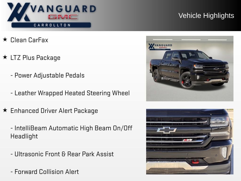 Discover the ultimate driving experience with this exceptional 2018 Chevrolet Silverado 1500 LTZ 2LZ. This powerful and versatile pickup boasts a commanding presence on the road, combining exceptional performance, advanced technology, and premium comfort features to elevate your driving journey.Highlighted by its striking Redline Edition, this Silverado LTZ 2LZ showcases a bold and distinctive style. Key features include: Clean CarFax Redline Edition with sport assist steps, black bow ties, spray-on bedliner, and 20 black-painted aluminum wheels with red accents LTZ Plus Package with power adjustable pedals, Bose premium audio, front and rear park assist, and heated leather steering wheel Enhanced Driver Alert Package with lane keep assist, IntelliBeam headlamps, forward automatic braking, and safety alert seat Heated and vented perforated leather-appointed front bucket seatsBeneath the hood, the EcoTec3 5.3L V8 engine delivers impressive power and efficiency, paired with an 8-speed automatic transmission and 4-wheel drive for exceptional capability. With an EPA-estimated 20 MPG on the highway, this Silverado strikes the perfect balance between performance and fuel economy.The premium cabin of this Silverado LTZ 2LZ is designed to provide the ultimate in comfort and convenience. Dual-zone automatic climate control, a power sunroof, and a Bose premium audio system create a refined and relaxing driving environment. Advanced safety features, including forward collision alert, lane keep assist, and front/rear park assist, work seamlessly to help keep you and your loved ones secure.Whether you're tackling tough jobs, towing heavy loads, or simply enjoying the open road, this 2018 Chevrolet Silverado 1500 LTZ 2LZ is the perfect companion. Experience the uncompromising power, sophisticated style, and premium amenities that make this Silverado truly exceptional.We invite you to visit our showroom and take this remarkable vehicle for a test drive. Let us demonstrate how this Silverado can elevate your driving experience and exceed your expectations. We're confident you'll be impressed by its capabilities and confident that it's the perfect fit for your needs.