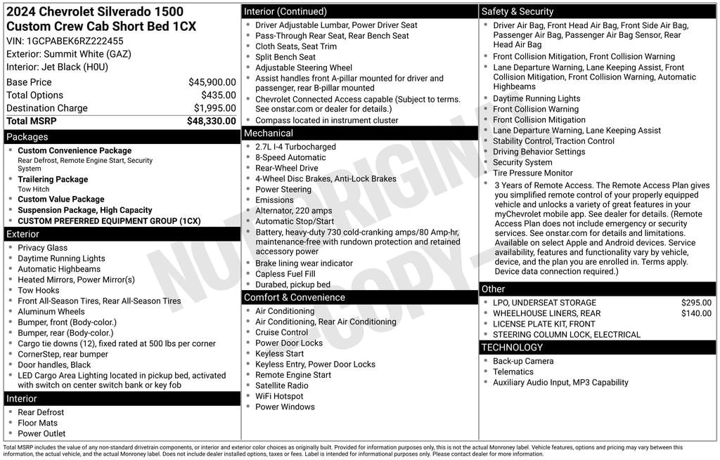 Discover the exceptional 2024 Chevrolet Silverado 1500 Custom, a versatile and capable pickup that's ready to elevate your driving experience. With its powerful 2.7L I4 Turbocharged engine, delivering 310 horsepower, and an impressive fuel efficiency of 18 city/22 highway MPG, this Silverado is the perfect blend of performance and efficiency.- Wheelhouse Liners, Rear- LPO, Underseat Storage (dealer-installed)- Heated Door MirrorsBeyond its impressive powertrain, this Silverado 1500 Custom offers an array of features that cater to your every need. Enjoy the convenience of the Chevrolet Infotainment 3 system, complete with SiriusXM Radio, Bluetooth connectivity, and a 120-Volt Bed Mounted Power Outlet. The Electronic Cruise Control and Remote Vehicle Starter System add to the overall driving ease, while the Rear Window Defroster and Automatic Emergency Braking provide added safety and comfort.Designed with both form and function in mind, the Silverado 1500 Custom boasts a sleek, modern exterior in a stunning White color. The 20 Bright Silver Painted Aluminum wheels and Deep-Tinted Glass enhance the vehicle's bold presence on the road. Inside, the Cloth Seat Trim and Color-Keyed Carpeting Floor Covering create a refined and comfortable cabin, perfect for long drives or daily commutes.Whether you're tackling tough jobs or embarking on weekend adventures, this Silverado 1500 Custom is ready to take on the challenge. With its impressive capabilities, advanced technology, and stylish design, it's the perfect choice for those seeking a versatile and capable pickup that exceeds expectations.Experience the power and refinement of the 2024 Chevrolet Silverado 1500 Custom for yourself. We invite you to visit our showroom and take this exceptional vehicle for a test drive. Our knowledgeable sales team is here to answer any questions you may have and help you find the perfect Silverado to meet your needs. Don't miss this opportunity to discover the ultimate in truck performance and utility.