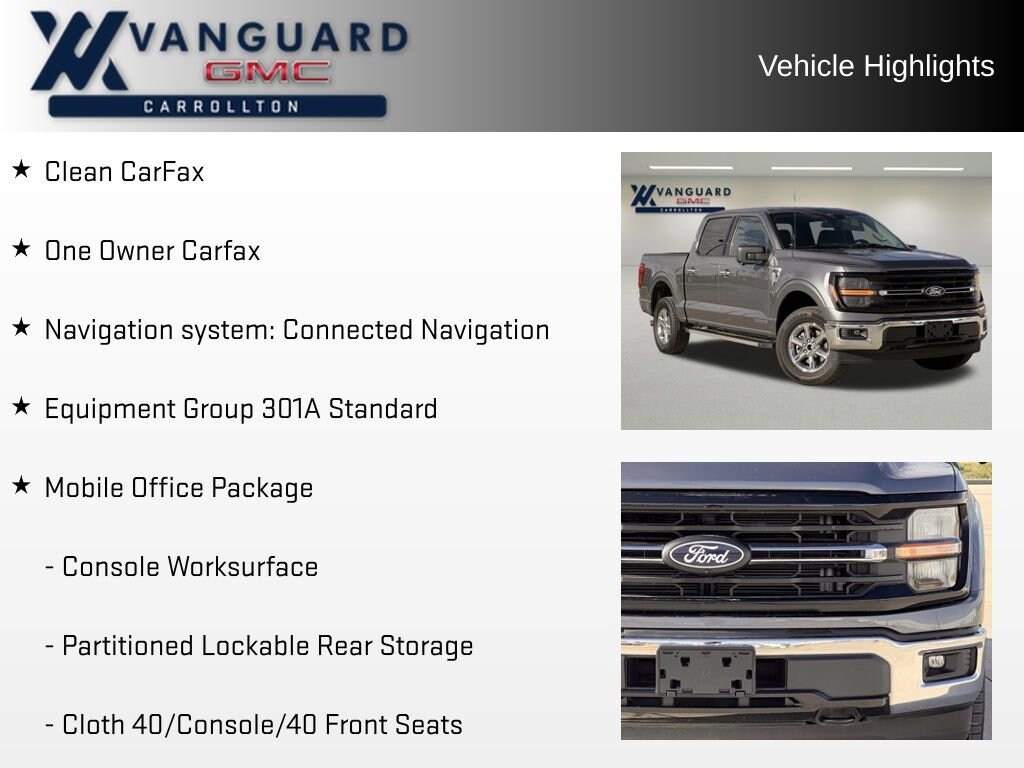Discover the perfect blend of power, efficiency, and versatility with this 2024 Ford F-150 XLT. This exceptional truck boasts a 3.5L PowerBoost Full-Hybrid V6 engine, delivering an impressive 22 city and 24 highway MPG, making it a true standout in its class. Clean CarFax One Owner Carfax 3.5L V6 Hybrid Twin Turbocharged (PowerBoost) (FULL-HYBRID) (Includes Pro Power Onboard 2.4KW and Removes 36 Gallon Fuel Tank, GVWR: 7,350 lbs Payload Package & Electronic Locking with 3.73 Axle Ratio) (*GROSS*) MOBILE OFFICE PACKAGE: Includes Partitioned Lockable Rear Storage, Console Worksurface Equipment Group 301A Standard Mobile Office Package Navigation system: Connected Navigation Automatic temperature control Front dual zone A/C Power driver seat Power steering Power windows Remote keyless entry Steering wheel mounted audio controlsThis F-150 XLT is more than just a capable workhorse; it's a true mobile office on wheels. With the MOBILE OFFICE PACKAGE, you'll enjoy a partitioned lockable rear storage area and a convenient console worksurface, making it the ideal companion for your on-the-go lifestyle. The Connected Navigation system and SYNC 4 with Enhanced Voice Recognition ensure you stay connected and informed, while the automatic temperature control and power features provide exceptional comfort.Beneath the sleek gray exterior lies a heart of pure power. The 3.5L PowerBoost Full-Hybrid V6 engine delivers a thrilling driving experience, with the added benefit of impressive fuel efficiency. Whether you're tackling tough terrain or navigating the city streets, this F-150 XLT is up to the task.Safety is also a top priority, with features like electronic stability control, brake assist, and a comprehensive airbag system ensuring your peace of mind on the road. The auto high-beam headlights and delay-off headlights provide enhanced visibility, while the rear step bumper and power door mirrors add convenience.Elevate your driving experience with this exceptional 2024 Ford F-150 XLT. Discover the perfect blend of power, efficiency, and versatility that will make every journey a pleasure. Visit our showroom today and let us demonstrate how this remarkable truck can transform the way you work and play.